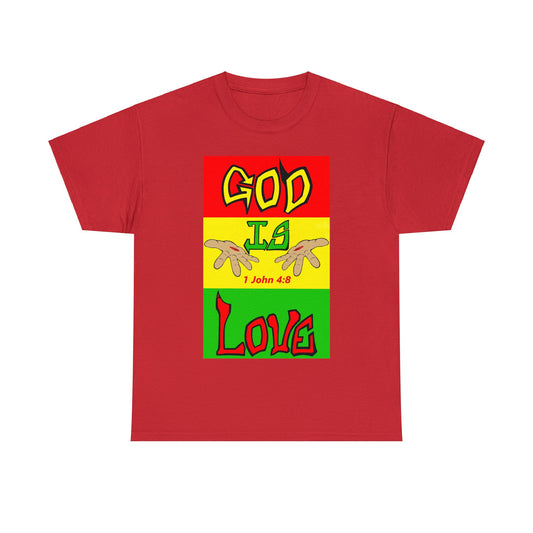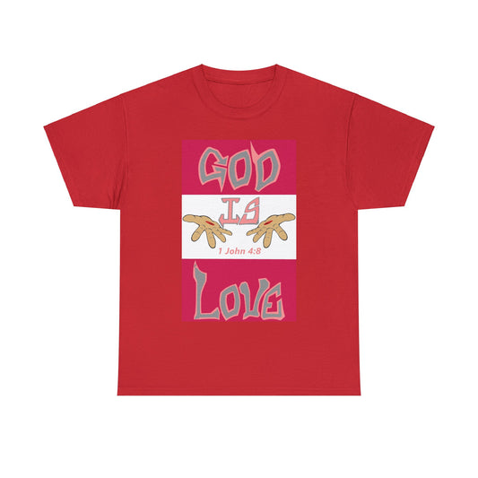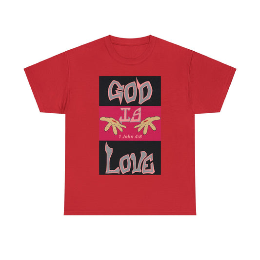 God is Love (RedBlk) multi-color t-shirt By The M.O.G (small print)